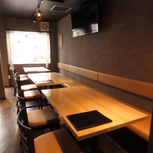 4人掛けテーブルを5卓ご用意しており、連結することで大人数にも対応可能です。落ち着いた雰囲気の店内で、女子会や各種ご宴会に最適◎ゆったりと美味しい料理とお酒をお楽しみいただけます。